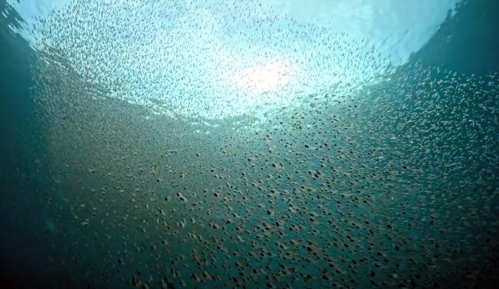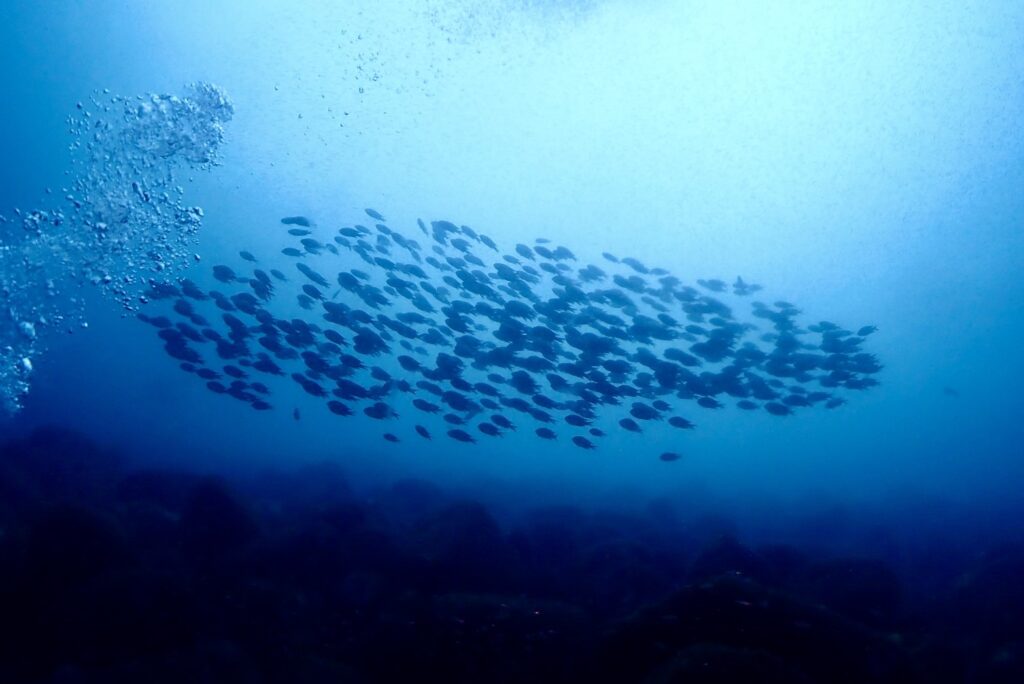 ファンチームは群れ群れ、スズメダイを見上げながら