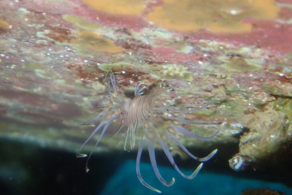 休息する、ミノカサゴの幼魚を観察しながら